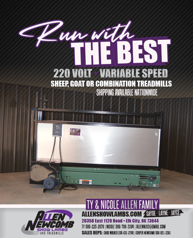 Allen Show Lambs & Treadmills is owned and operated by Ty & Nicole Allen and their girls; Sayde, Layne, and Jayce. As well as Cooper & Victoria Newcomb and their kids; Brynlee, Lakelynn, and Stockton. They reside in Elk City, OK where Ty and Cooper were born and raised. Currently, they lamb out approximately 300 head of mature ewes and buy/sell show lambs throughout the country.